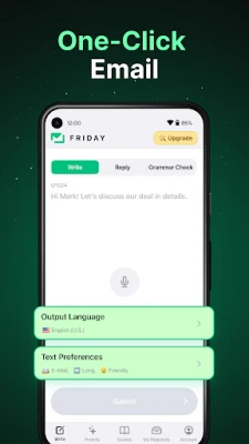 Whether you want to write to your partner, friend, or colleague, get advice, or find new connections, Friday has it covered. Whether you're a student, a professional, or someone who wants to improve their writing, Friday is here to help.