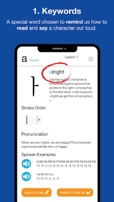Learn the first 6 Hangul letters for free! If you're impressed, then unlock the rest of the course with a small In App Purchase.