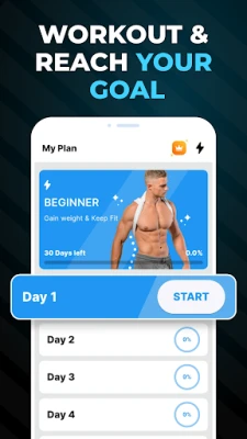 Follow the 30-day plan and take just 5-10 min a day workout and eat according to diet plan or calorie to gain weight and keep fit! No gym, no equipment needed, just use your bodyweight to keep fit and build muscles. 3 Difficulty Levels It has 3 levels for everyone, both beginner and pro.